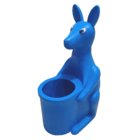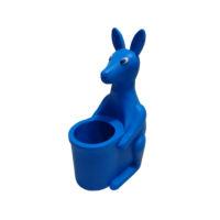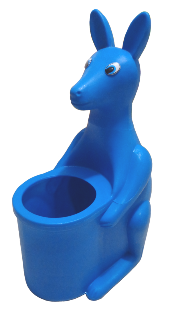Confeccionado em polietileno rotomoldado com aditivos UV que permite ficar exposto ao tempo sem perder a coloração, lixeira temática, em forma de canguru, olhos confeccionados em plástico acrílico com rosca de encaixe.