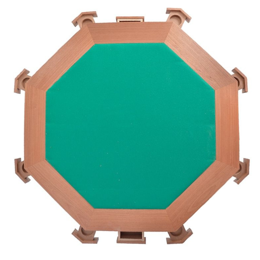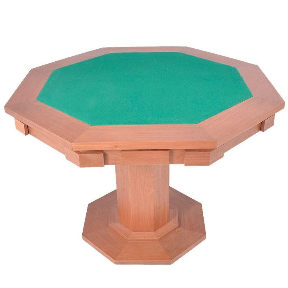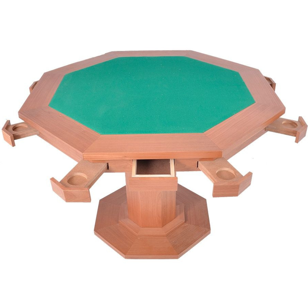 Mesa oitavada para jogar carteado, confeccionada em MDF folheado e envernizado, possui 02 gavetas, 08 porta copos e pé central oitavado.