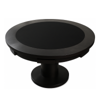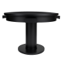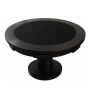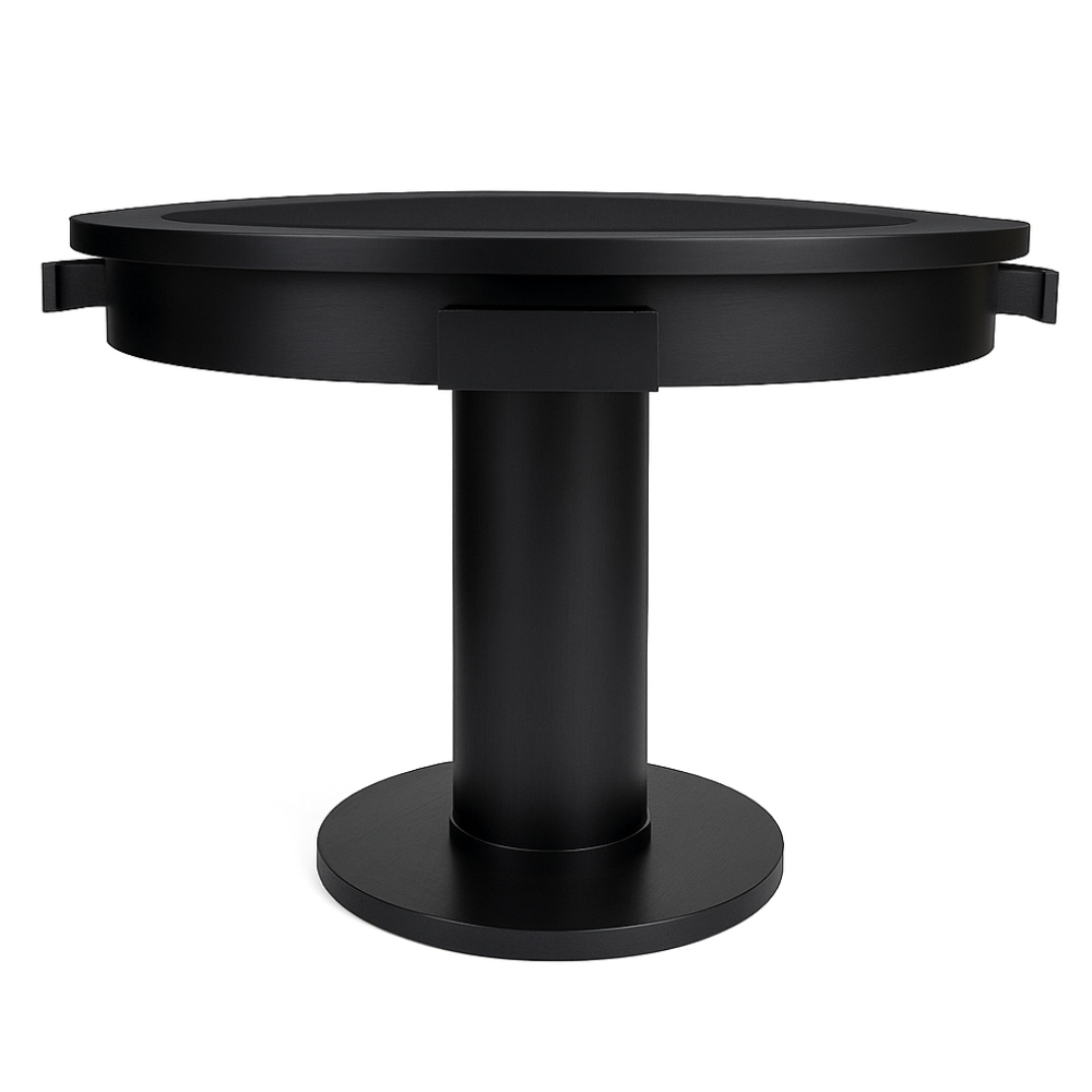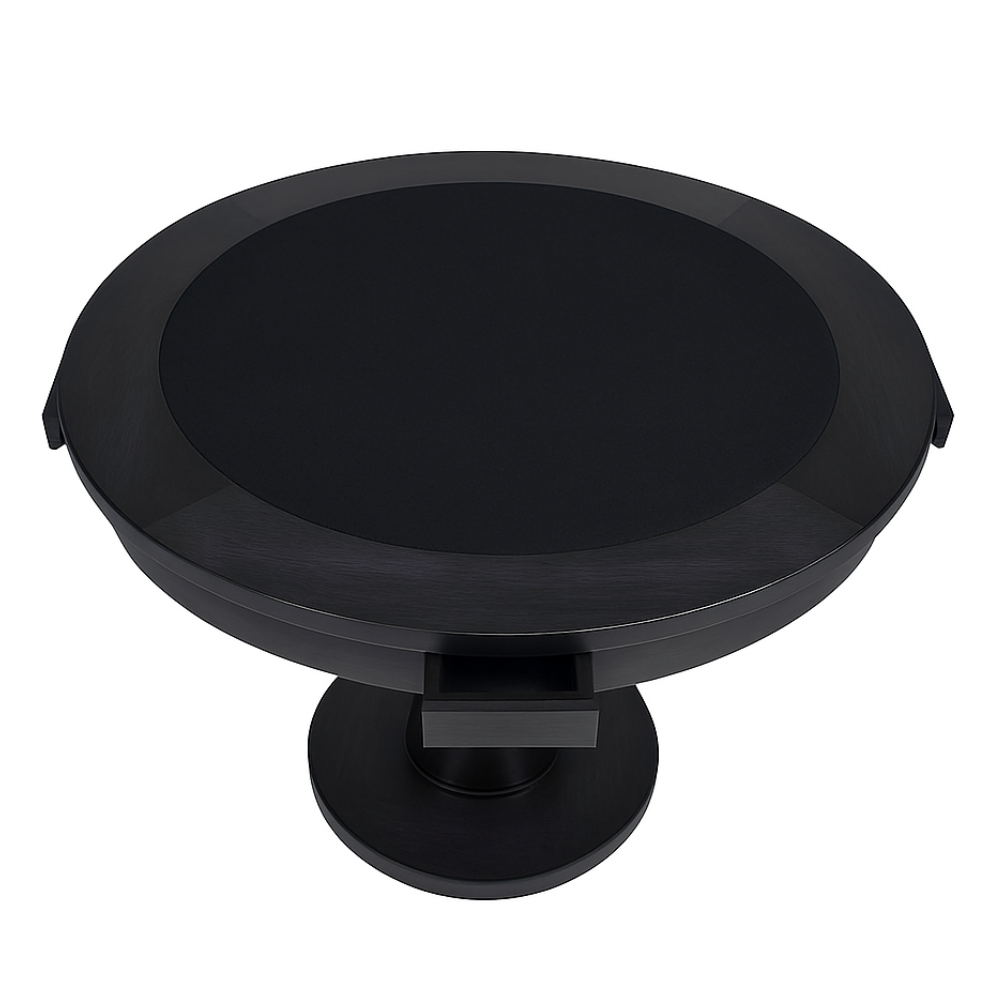 Mesa redonda para jogar carteado, confeccionada em MDF folheado no tom preto, sem porta-copos, possui 04 gavetas e pé central redondo.