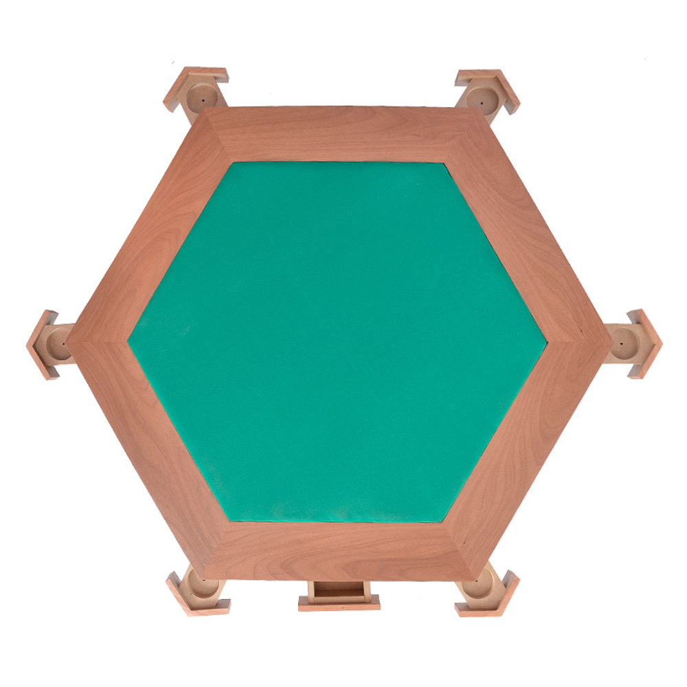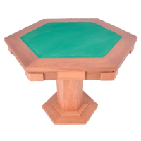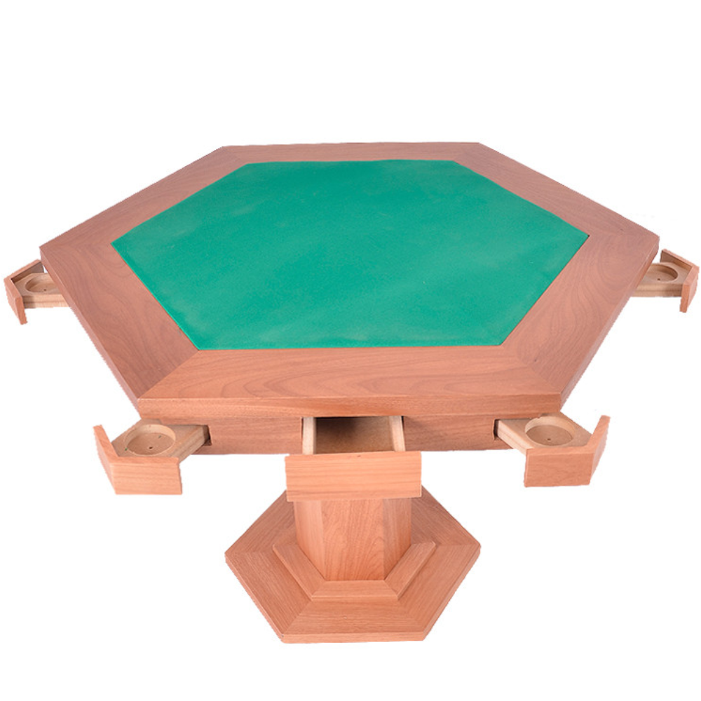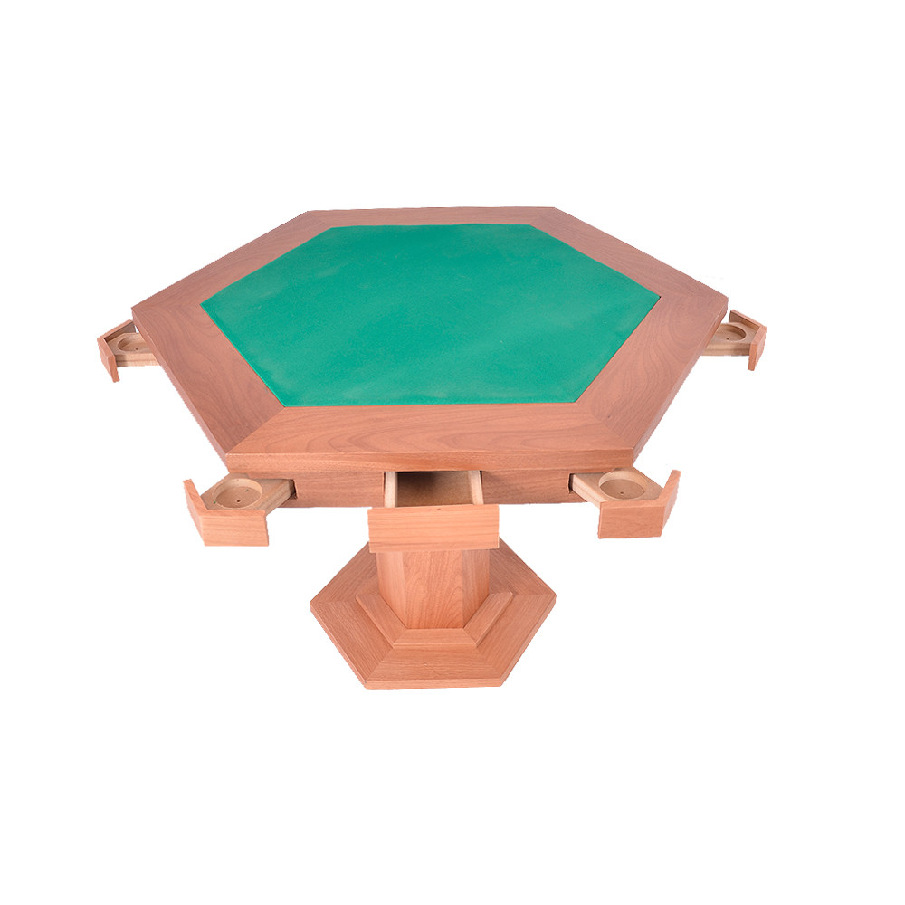 Mesa sextavada para jogar carteado, confeccionada em MDF folheado e envernizado, possui 02 gavetas, 06 porta-copos e pé central sextavado.