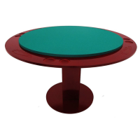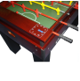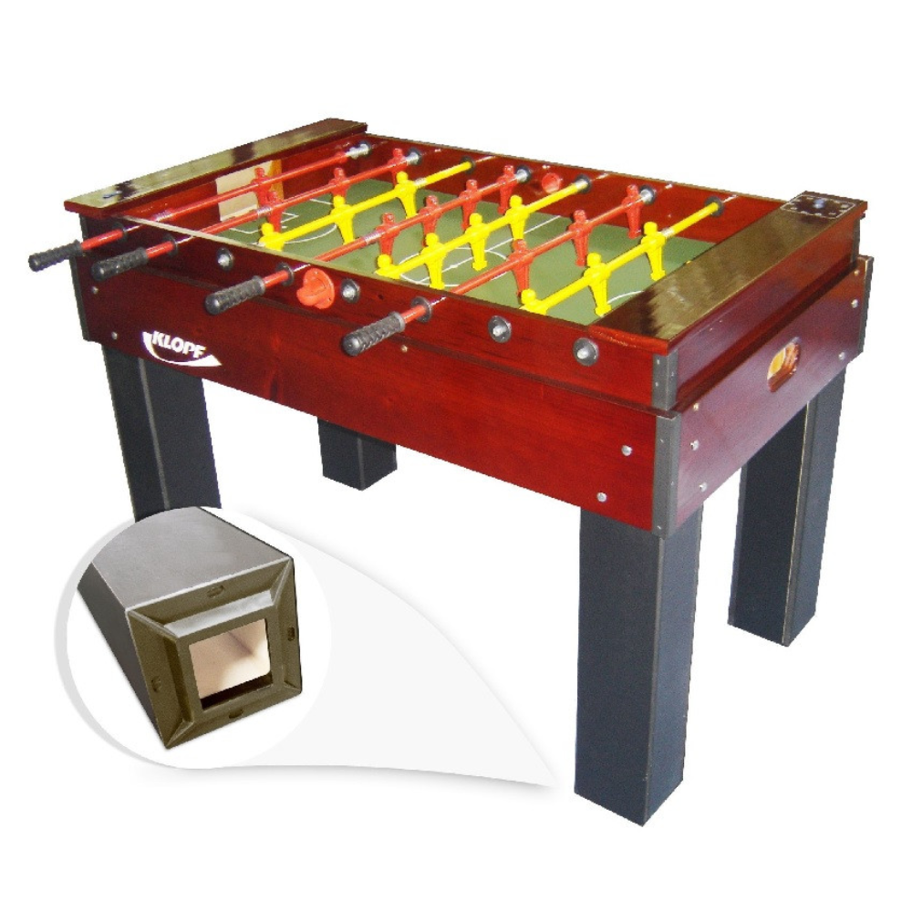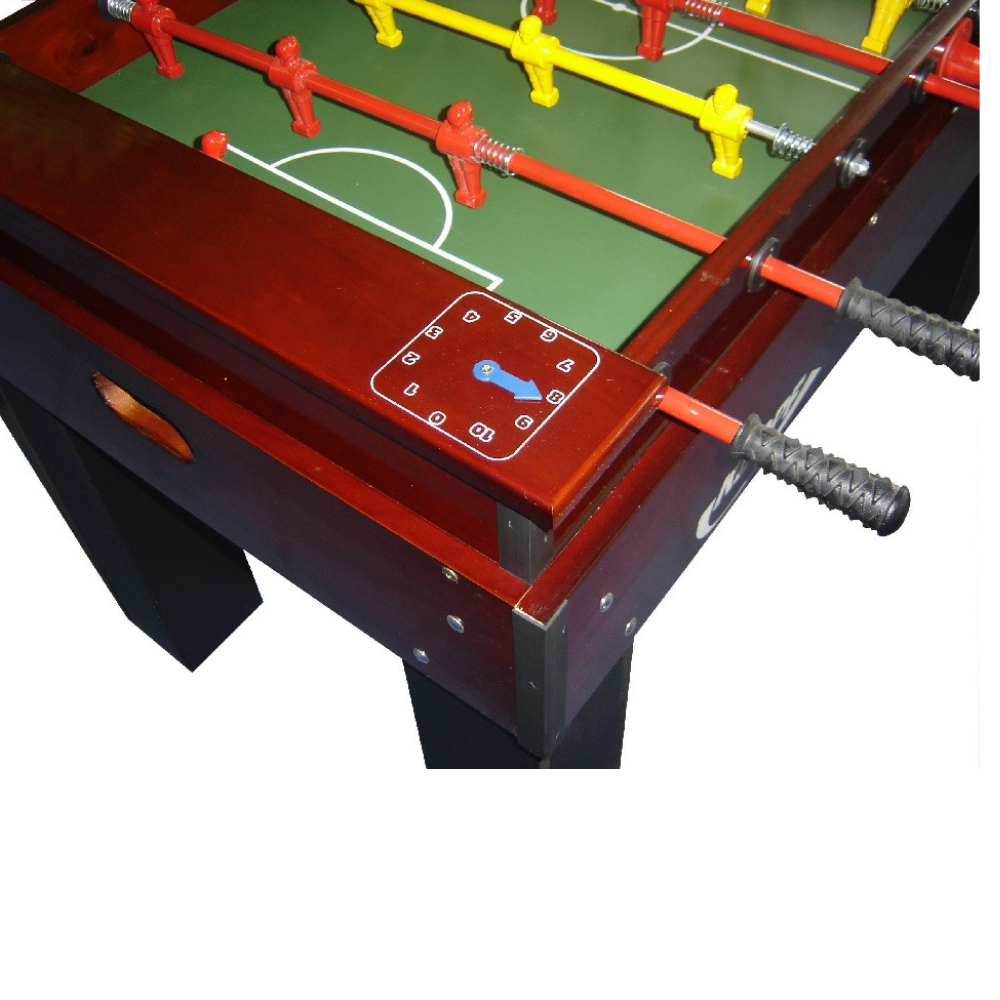 Mesa de pebolim nas medidas oficiais com estrutura da caixa produzida em madeira maciça pinus com acabamento em verniz tingido brilhante, bonecos em alumínio fundido com pintura epóxi e varões embutidos, goleiro com giro de 360º; contador de pontos e pés em MDP com sapata em polipropileno que evita a umidade nos pés.