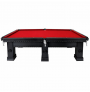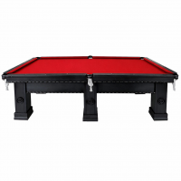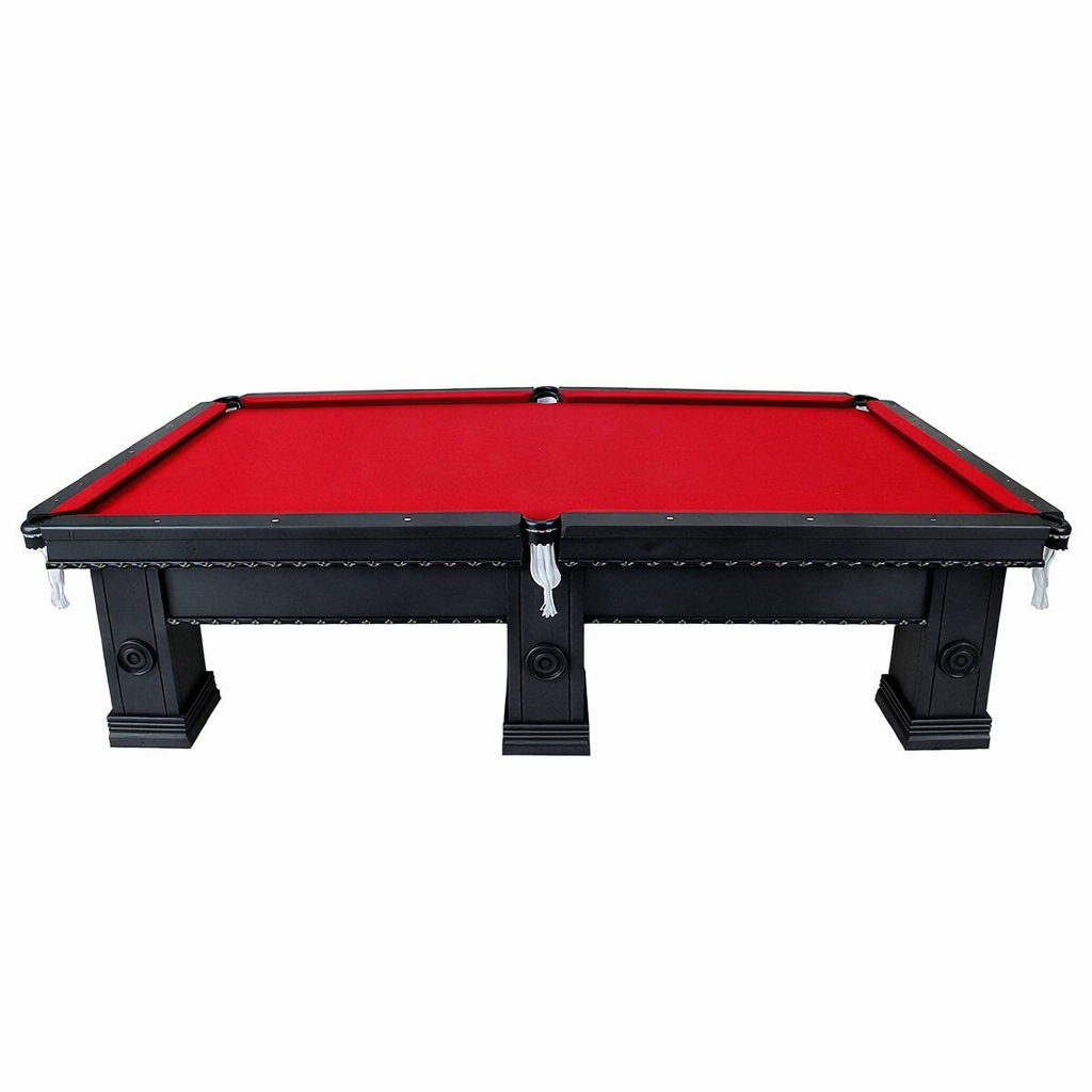 Mesa de sinuca profissional com 6 pés e campo de jogo em pedra ardósia 3 cm de espessura e confeccionada em madeira maciça na cor preta com prancha de 4 cm de espessura, tapeçada em lã na cor vermelha e borracha Tavares.