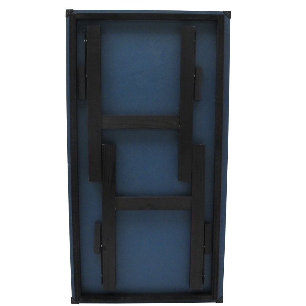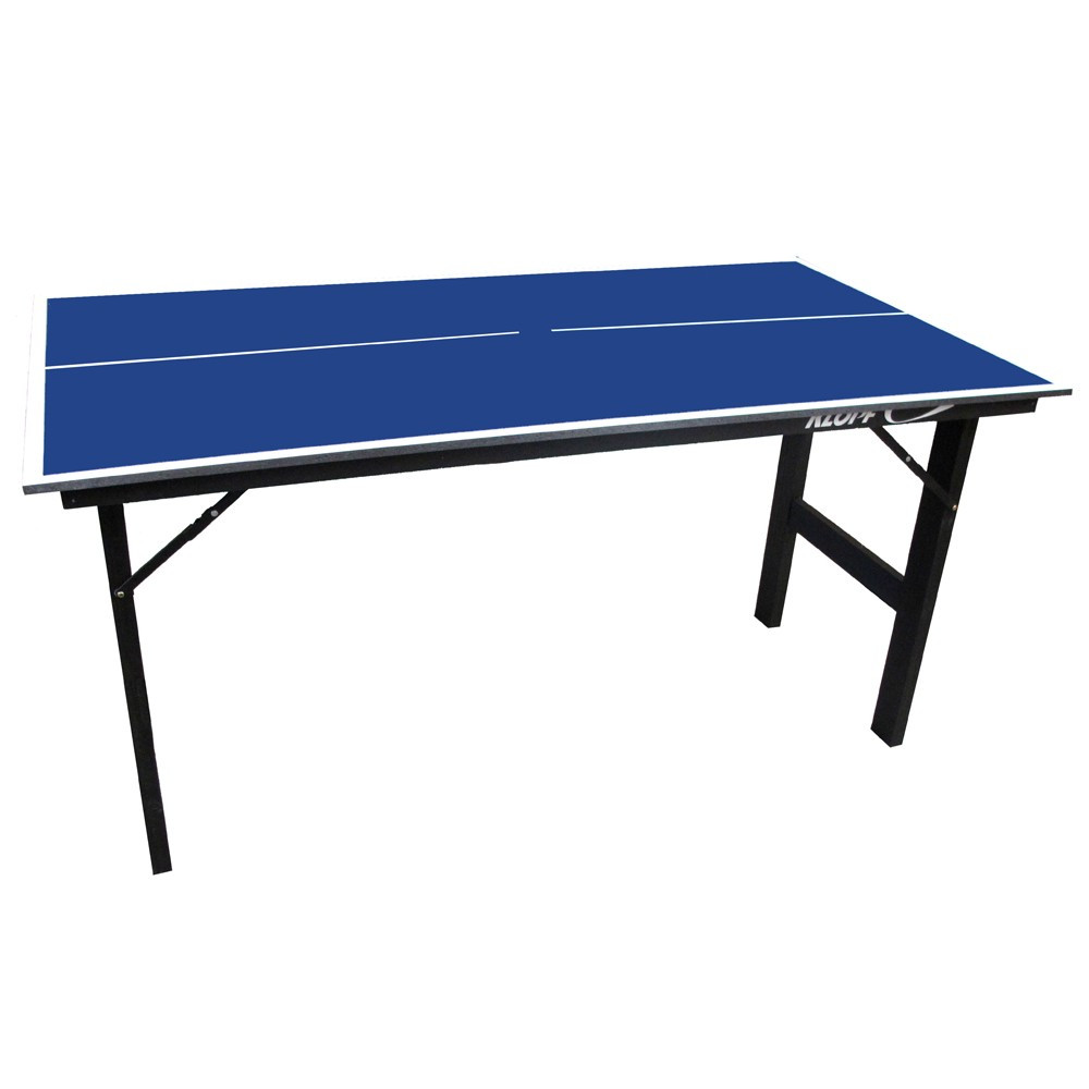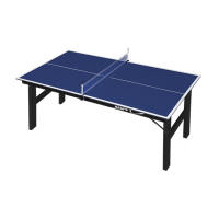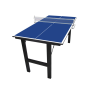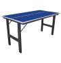 Mesa desmontável para tênis de mesa infantil com campo de jogo confeccionado em MDP de 12 mm de espessura e com acabamento em primer azul e linhas demarcatórias na cor branca, possui pés dobráveis em madeira maciça, ideal para crianças e locais que possuem pequenos espaços.