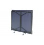 Tênis de mesa com campo de jogo confeccionado em MDF de 18 mm de espessura e com acabamento em laca azul fosco e linhas demarcatórias na cor branca, possui pés dobráveis articulados em ferro e com pintura eletrostática preta, além de rodinhas na parte inferior do tampo, as medidas são oficiais atendendo aos padrões da ITTF (International Table Tennis Federation).