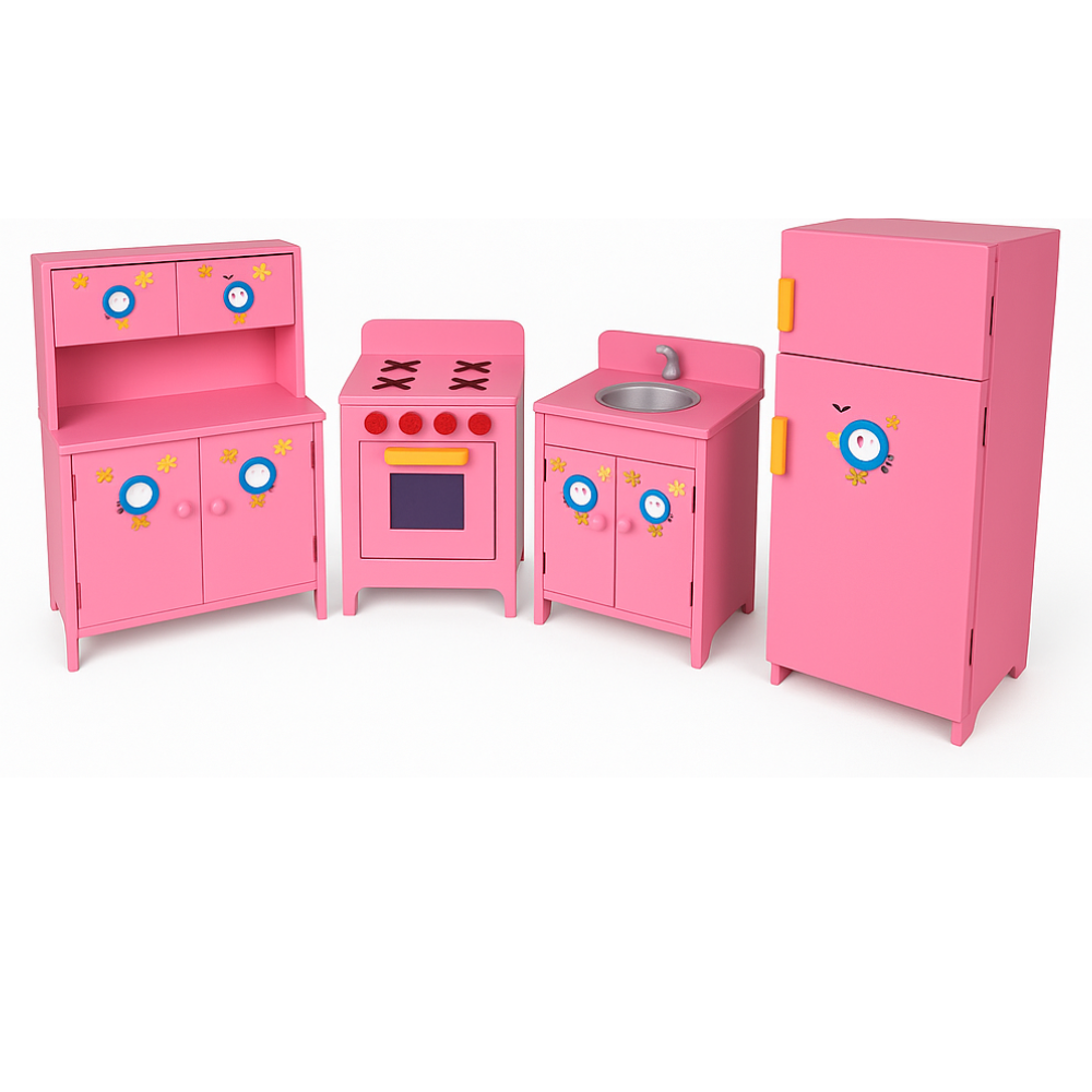 Acompanha 04 peças sendo em formato de armário, fogão, pia e geladeira.