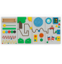 Contém: montanha russa espiral e montanha russa ondulada, um gira bola (sonoro), um circuito dos animais com peças, um labirinto magnético com esferas de aço e caneta magnética, uma ampulheta com areia colorida, uma manivela de rotação com engrenagem, um jogo da velha, um labirinto de meios de transportes, dois alinhavos em formato de tênis com cadarços para amarrar com orifícios para poder passar o cadarço, duas rodas de engrenagem, uma barra roscada, um kit formas geométricas com 8 cavidades que se encaixam diretamente no painel, um circuito de engrenagens coloridas sendo seis engrenagens médias coloridas e uma engrenagem grande superior, quatro portas surpresas com diferentes fechaduras.
