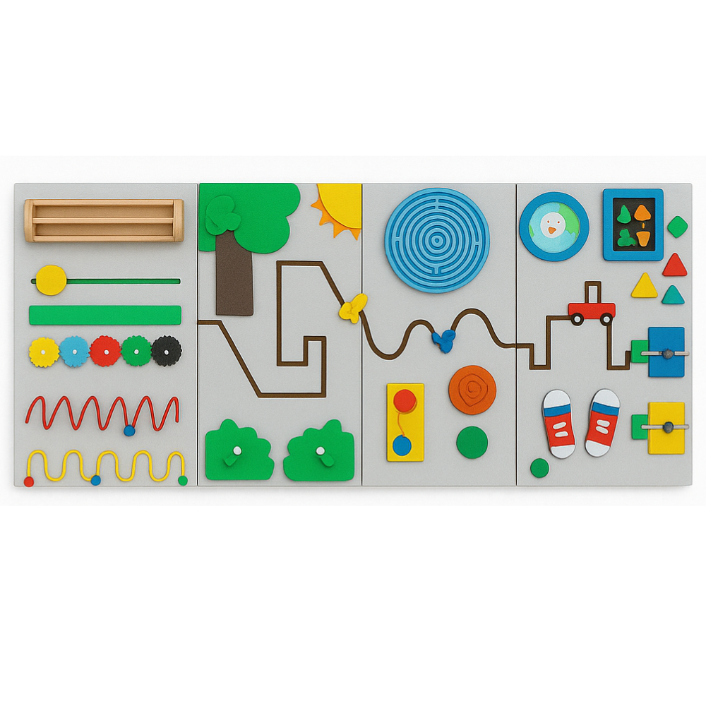 Painel dividido em 5 módulos compostos por jogos de atividades motoras, sensoriais, e sonoras