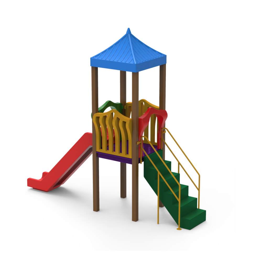 O brinquedo também conta com travas de fixação em sua base, permitindo que seja chumbada ou fixada diretamente ao solo conforme as exigências de segurança e instalação.